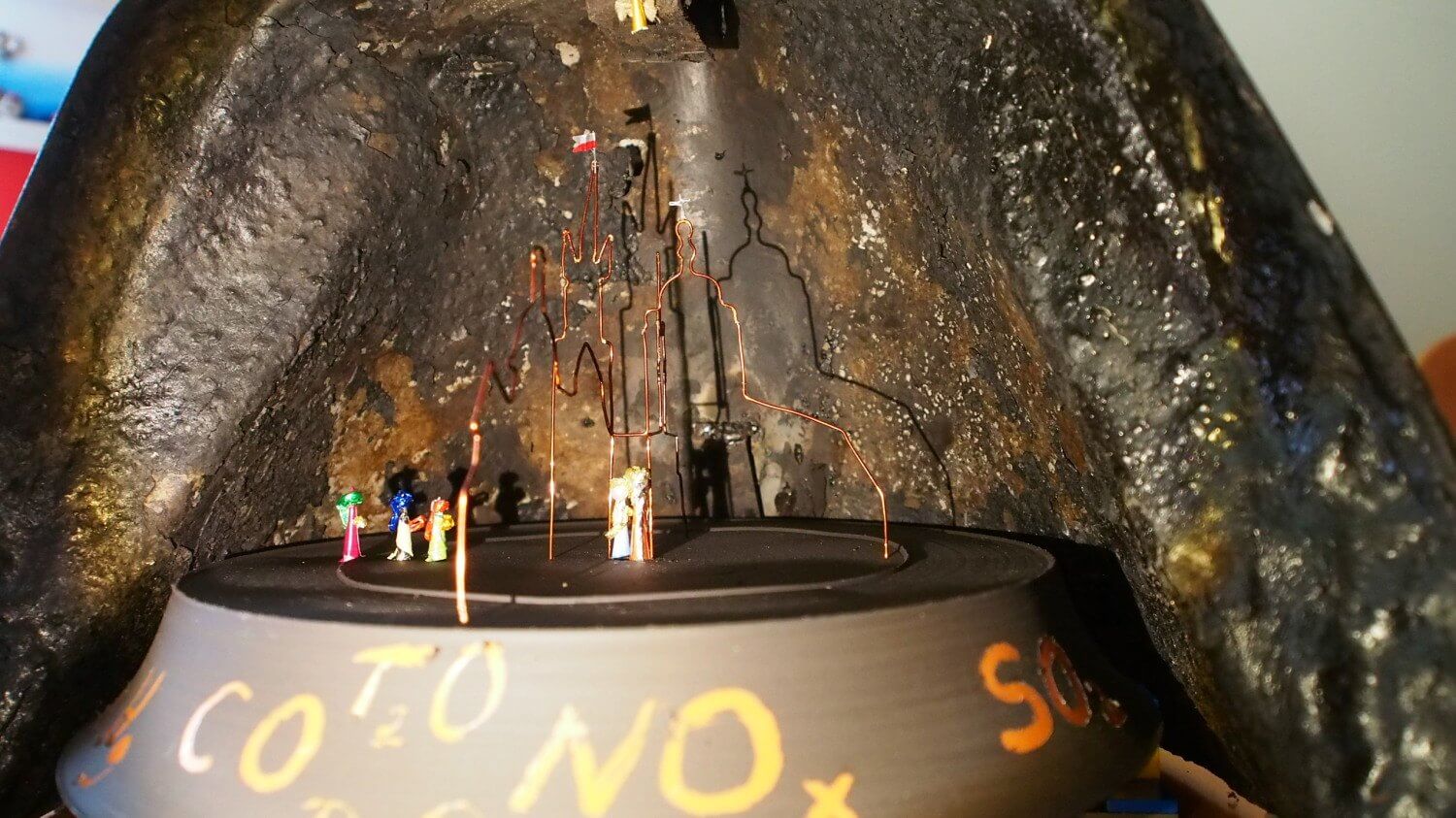 Początkowo szopka miała być teatrem cieni, odbijanym na białym pergaminie. Ale w ręce jej twórcy wpadł kawałek starego komina, który idealnie nadawał się na dach małej budowli.