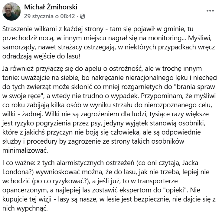Nie bójmy się chodzić do lasu – tak mogłoby brzmieć clue komentarza, który prof. Żmihorski zamieścił kilka tygodni temu w swoich mediach społecznościowych. – Stąd też mój apel, żeby pielęgnować naszą więź z lasem i ją odnawiać w rzeczywistości, zamiast budować obraz lasu przez posty na platformach i sensacyjne doniesienia prasowe o „niebezpiecznych wilkach”.