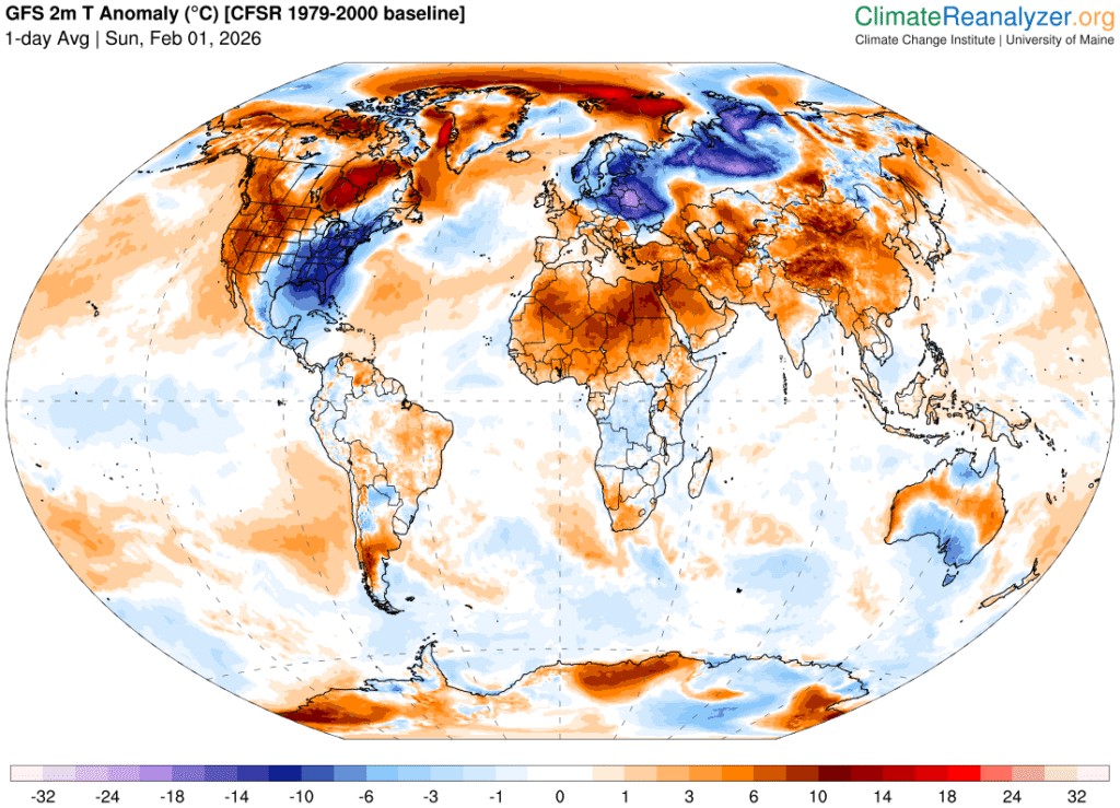 Odchylenia temperatur od średniej z lat 1979-2000 na świecie dla 1 lutego 2026 roku. Źródło: Uniwersytet w Maine.