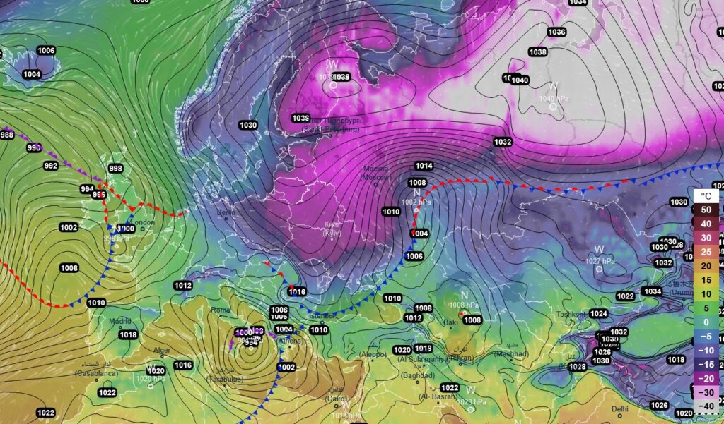 Temperatury oraz rozkład ciśnienia atmosferycznego w Europie i zachodniej części Azji 1 lutego 2026 roku w godzinach porannych. Źródło: Ventusky.