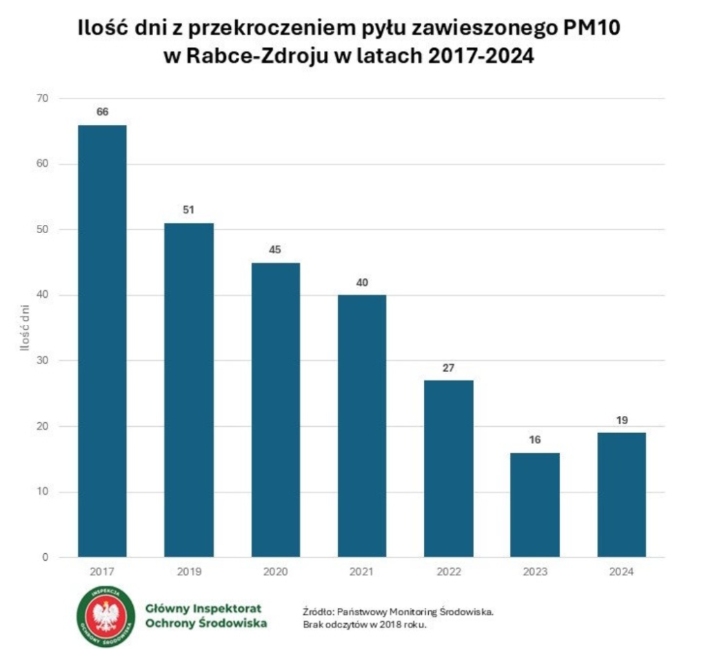 Sam burmistrz pokazuje nam wyniki pomiarów jakości powietrza, a właściwie przekroczeń, ale z wyłączeniem gm. Rabka-Zdrój. Uzdrowiskowa gmina chce zerwać z wcześniejszą złą sławą i chwali się postępami. Samorząd powołuje się na raport Głównego Inspektoratu Ochrony Środowiska, dotyczący liczby dni z przekroczeniem poziomu dopuszczalnego dla stężeń 24-godzinnych dla pyłu zawieszonego PM10 w latach 2017-2023: 2017 – 66 dni, 2019 – 38-65 dni, 2020 – 45 dni, 2021 – 40 dni, 2022 – 27 dni, 2023 – 16 dni. Stężenie średnioroczne w Rabce-Zdroju w 2024 roku wyniosło 20 µg/m3, a liczba dni z przekroczeniem normy dobowej wyniosła 19.