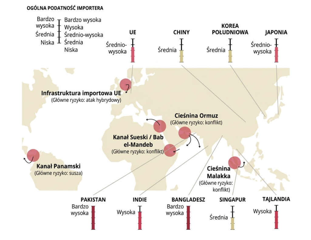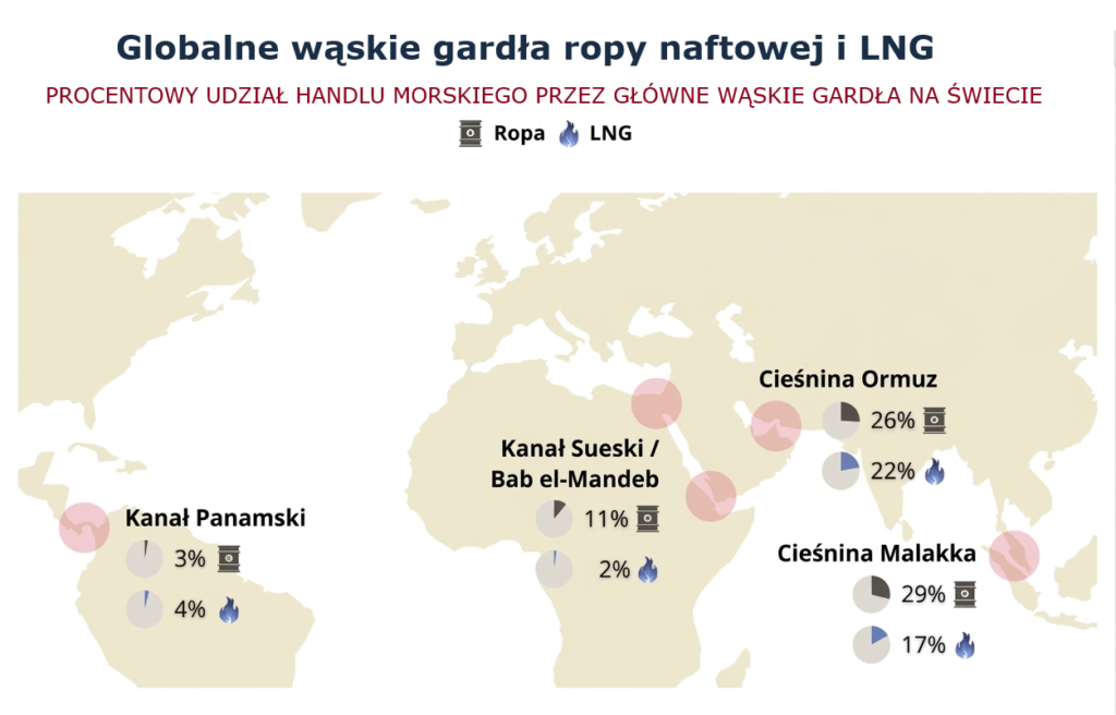 Zakłócenie w takim punkcie nie jest lokalne. Natychmiast wywołuje skok cen, chaos logistyczny i globalne napięcia gospodarcze. A na Cieśninie Ormuz się nie kończy. Według raportu „Beyond Securing Supply” opracowanego przez E3G, jest parę innych tego typu miejsc, które pokazuje powyższa mapa.
