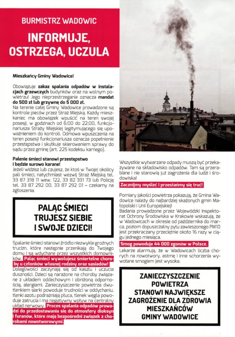 Oto burmistrz Mateusz Klinowski przygotował dla mieszkańców „smogowe” ulotki, w których mówiąc delikatnie nie owija. To zupełnie inne podejście niż to, do którego przyzwyczaiła większość samorządowców (więcej TUTAJ).