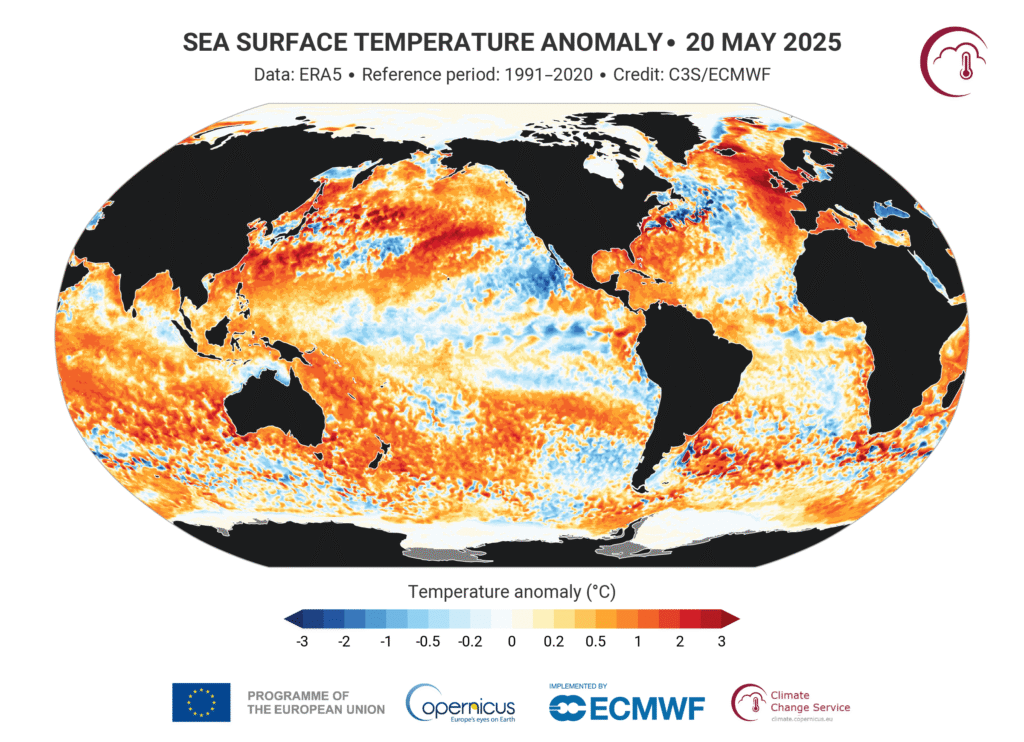 Przykładem jest na przykład morska fala upałów na Oceanie Atlantyckim, a dokładnie wokół Wysp Brytyjskich i Irlandii. Temperatury u zachodnich wybrzeży Wysp Brytyjskich były wyższe o 2–4 st. C od średniej wieloletniej w maju zeszłego roku.