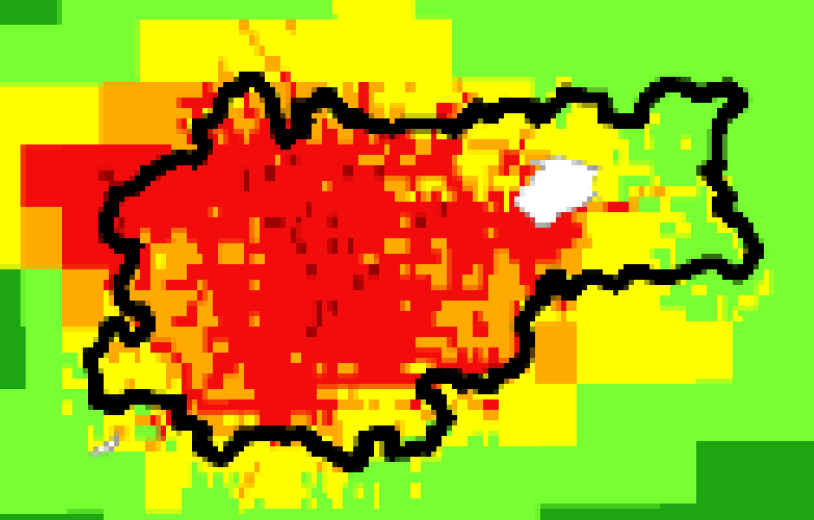 Rys. Rozkład przestrzenny wartości stężenia średniego rocznego NO2, źródło: Dodatkowa ocena jakości powietrza za rok 2024 dla województwa małopolskiego, GIOŚ, Rysunek 5.18. Czerwone obszary pokazują przekroczenie nowej normy (20 ug/m3)