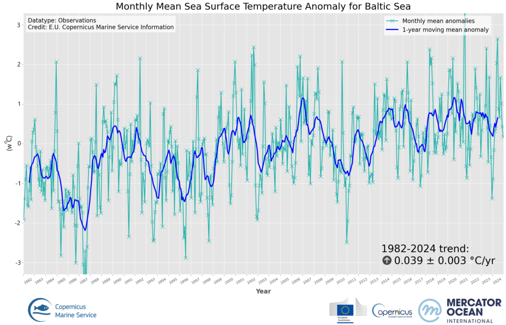 Wykres pokazuje, że temperatury wody w Bałtyku rosną – w tempie 0,4 st. C na dekadę. To wbrew pozorom nie jest małą wartością. W rezultacie populacja dorsza jest w bardzo złym stanie. I nie dotyczy to tylko samego Bałtyku. Ociepla się także północny Atlantyk, co szkodzi tamtejszej faunie, w tym dorszom atlantyckim.