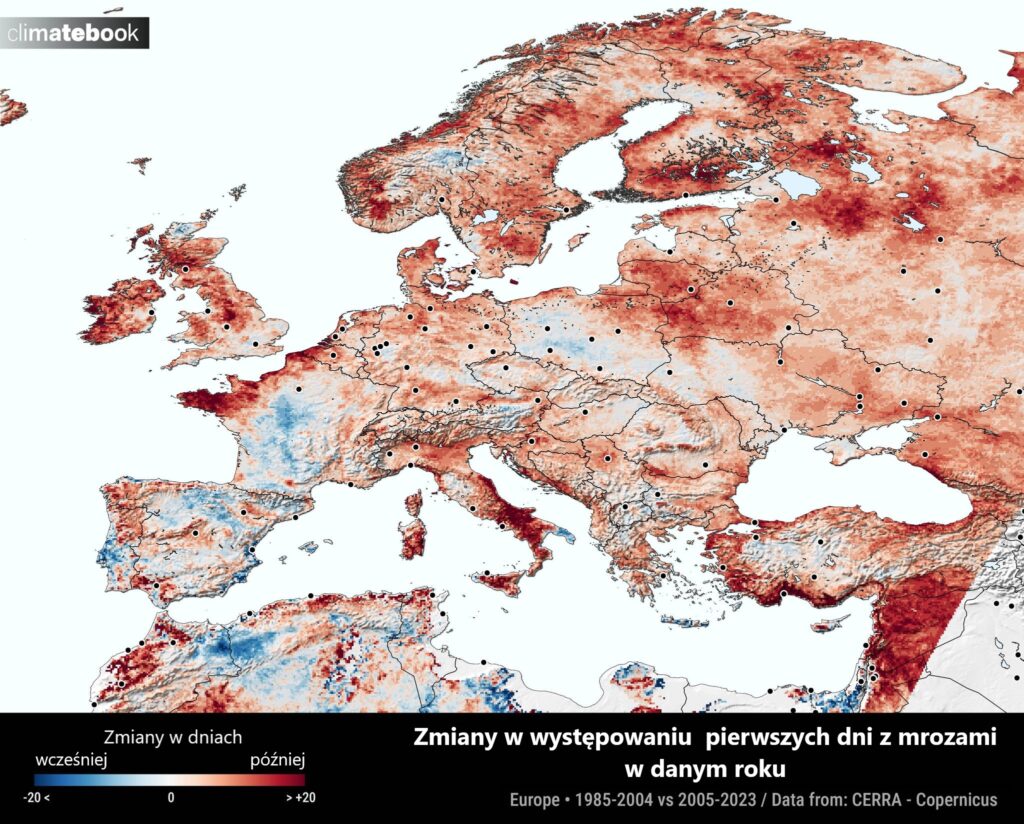 Pierwszy dzień w roku z temperaturą spadającą do zera lub poniżej pojawia się coraz później. W niektórych regionach Europy nawet o trzy tygodnie później niż 20 lat temu. Dotyczy to zwłaszcza wschodniej i północnej części kontynentu, w tym Polski. Choć zdarzają się miejsca, gdzie mrozy występują wcześniej, dominują obszary, gdzie liczba dni mroźnych maleje.