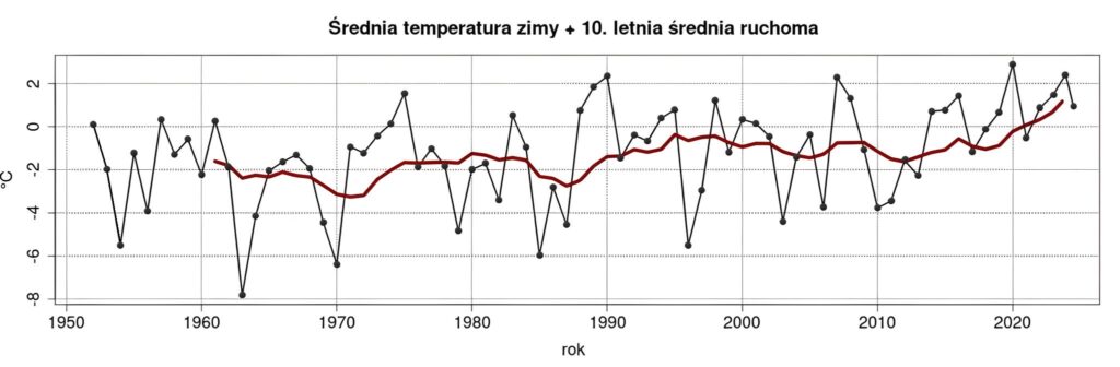 Choć ostatnia zima nie była rekordowo ciepła, to jak pokazuje wykres, była jedną z najcieplejszych w historii. Średnia temperatura była o 1,33 st. C wyższa od średniej lat 1991-2020. Była to kolejna zima z dodatnią temperaturą. Jedynie luty był w normie, choć z małą ilością śniegu.