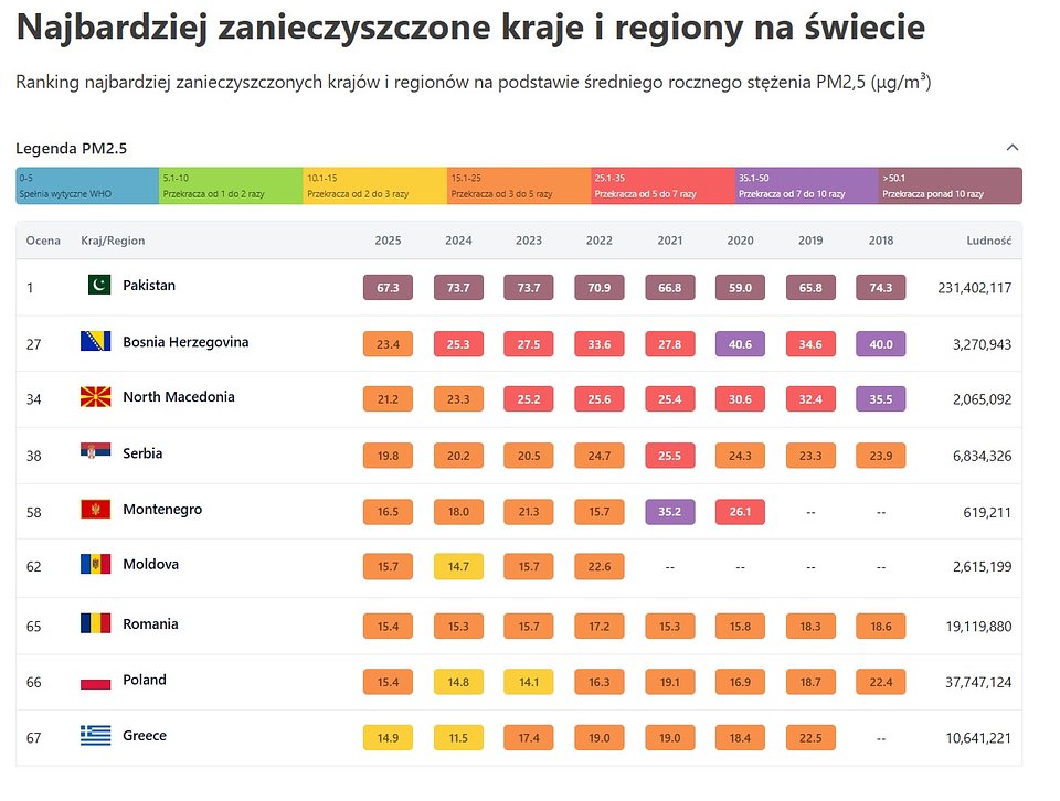 Polski wynik z raportu IQAir za miniony rok (15,4 μg/m³) mieści się co prawda w obecnej normie jakości powietrza (20 μg/m³), ale lokalnie norma ta bywa nadal przekraczana. W wielu miastach Polski nawet kilkukrotnie. WHO wskazuje natomiast, że bezpiecznym poziomem PM2,5 jest 5 μg/m³, czyli wynik dla Polski jest przekroczony trzykrotnie. Te ambitne wytyczne spełniły w 2025 r. jedynie trzy europejskie kraje: Andora, Estonia i Islandia.