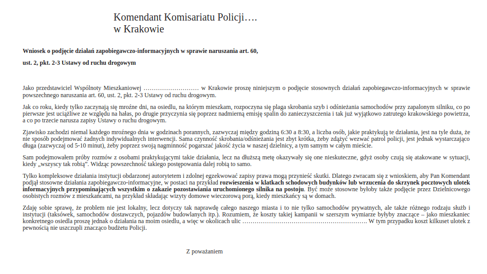 – Jak co roku, kiedy tylko zaczynają się mroźne dni, na osiedlu, na którym mieszkam, rozpoczyna się plaga skrobania szyb i odśnieżania samochodów przy zapalonym silniku, co po pierwsze jest uciążliwe ze względu na hałas, po drugie przyczynia się poprzez nadmierną emisję spalin do zanieczyszczenia i tak już wyjątkowo zatrutego krakowskiego powietrza, a co po trzecie narusza zapisy Ustawy o ruchu drogowym – napisał autor wspomnianego listu i dodał w nim: – Sam podejmowałem próby rozmów z osobami praktykującymi takie działania, lecz na dłuższą metę okazywały się one nieskuteczne, gdyż osoby czują się atakowane w sytuacji, kiedy „wszyscy tak robią”. Widząc powszechność takiego postępowania dalej robią to samo.
