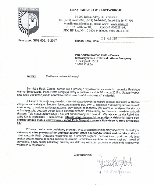 Wnosimy o tym z tego, że skierowała do nas pismo, w którym domaga się wyjaśnienia wypowiedzi naszego rzecznika prasowego Piotra Siergieja, który wskazał na znaczące przekroczenia normy zawartości rakotwórczego benzo(a)pirenu w rabczańskim powietrzu i stwierdził, ze te są podstawą do podjęcia działań, by Rabce odebrać status uzdrowiska.