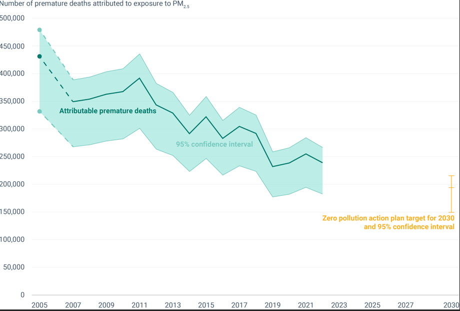 Komisja Europejska wyznaczyła bowiem cel zmniejszenia wpływu zanieczyszczenia powietrza na zdrowie o co najmniej 55 proc. do 2030 r. w porównaniu z 2005 rokiem. Okazuje się, że Wspólnota idzie pod tym względem w dobrym kierunku – w latach 2005–2022 liczba przedwczesnych zgonów w UE spowodowanych pyłem PM2.5 spadła aż o 45 proc.