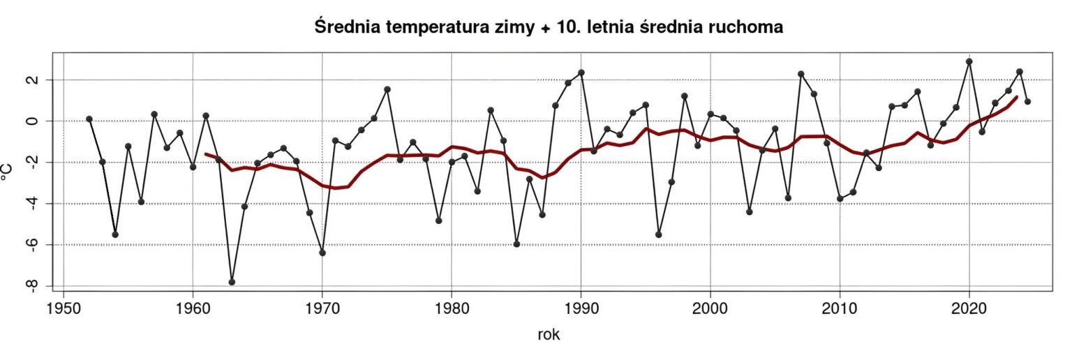 Nic dziwnego, że odzwyczailiśmy się od zimy. Od 2014 roku tylko trzy zimy były chłodne, czyli takie, w których średnia temperatura była niższa niż zero stopni. Ilustruje to powyższy wykres. Dawniej ciepłe zimy również się zdarzały – zwykle w związku z zachodnią cyrkulacją powietrza, ale należały do rzadkości. Te mroźne dominowały, nawet jeszcze na początku XXI wieku. Starsi ludzie, a nawet ci w średnim wieku, muszą pamiętać zimy z dzieciństwa i młodości.