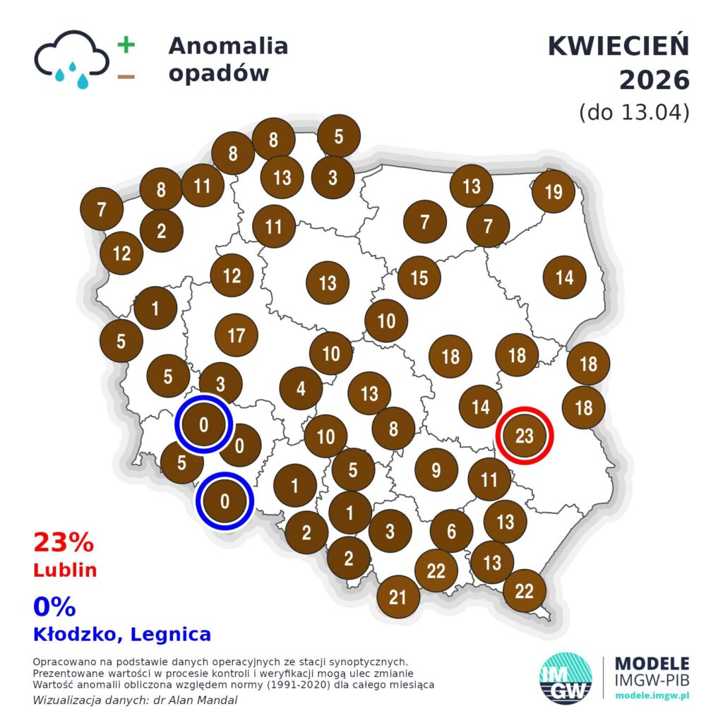 W marcu suma opadów wyniosła zaledwie 10,8 mm, czyli o 27 mm mniej od normy z lat 1991–2020. To tylko 29 proc. normy – miesiąc należy uznać za skrajnie suchy.