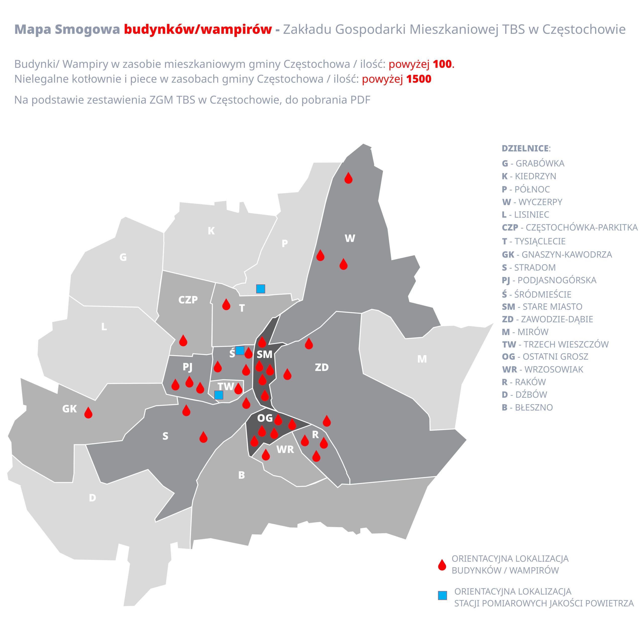 Jak mówi Hubert Pietrzak, wspomniane patologie dotyczą nie tylko kilku bloków na ul. Krakowskiej, ale ponad 100 wielorodzinnych budynków i około 1500 pozaklasowych pieców w ZGM “TBS” w Częstochowie. Nad sprawą pracuje Częstochowski Alarm Smogowy.